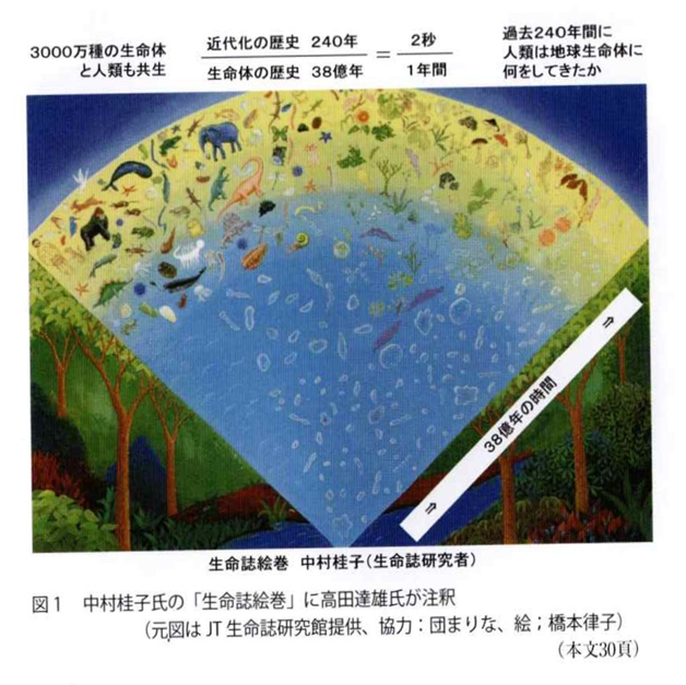 絵の上のコメントは高田達雄氏が書き入れた注釈です。人類は3000万種の生命体と共生していますが、近代化の240年は38億年を1年とすると2秒です。非常に短時間で人類は地球環境を急激に劣化させています。