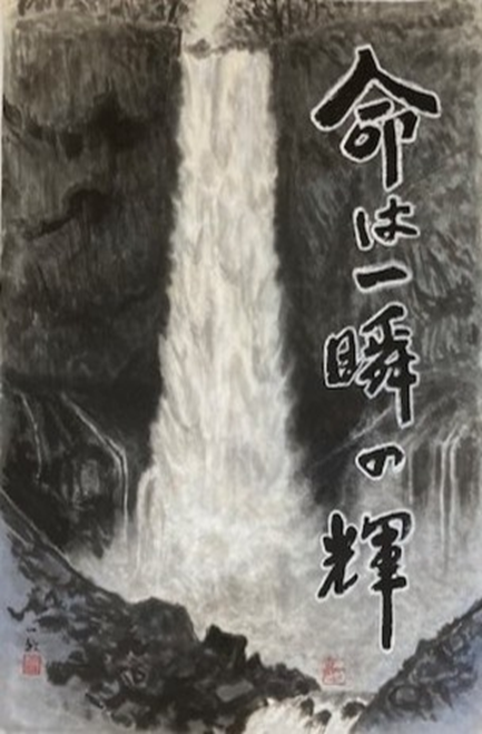 瀧のように滔々と流れ落ちる水流は、心の変化の速さと、命の一瞬の輝きを表しているとの思いで言葉を書き入れました。